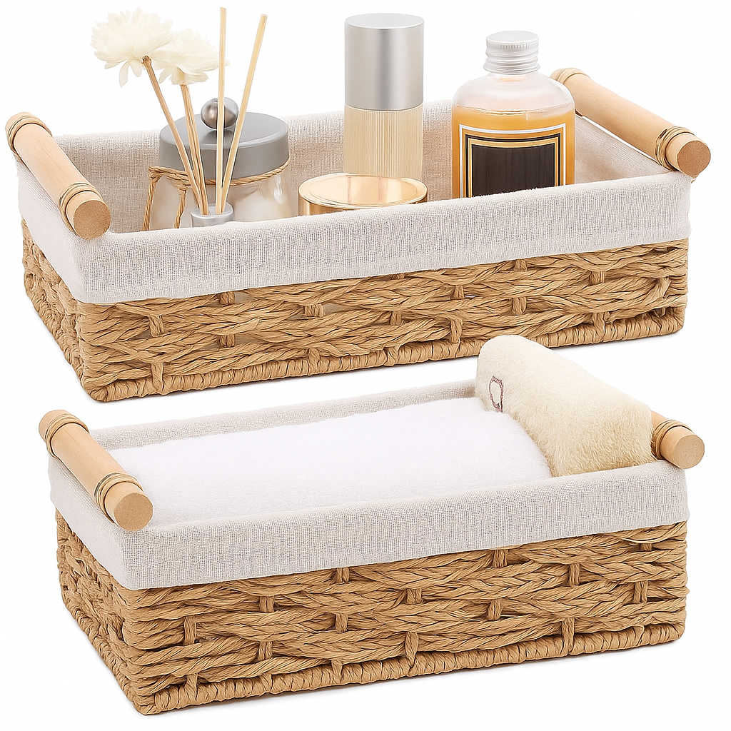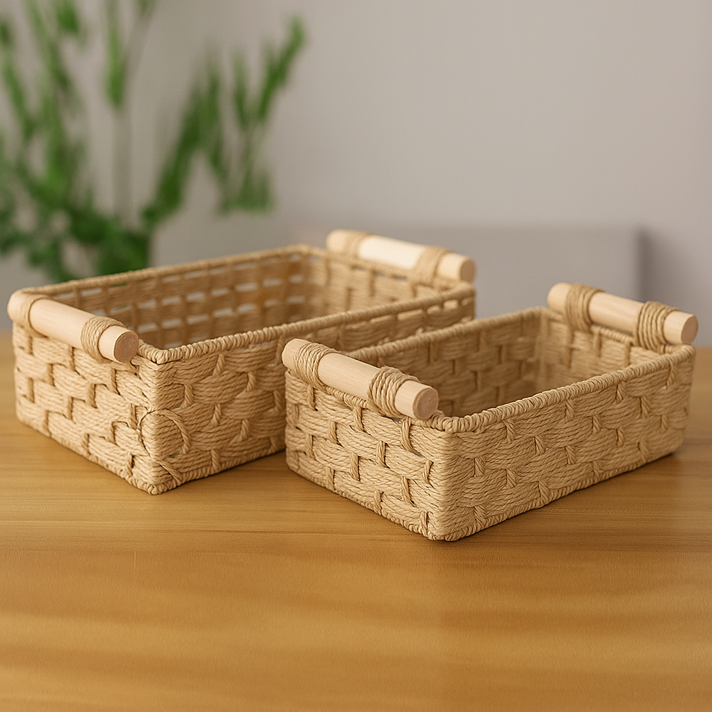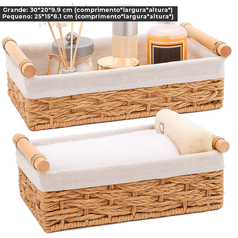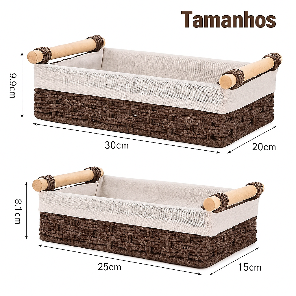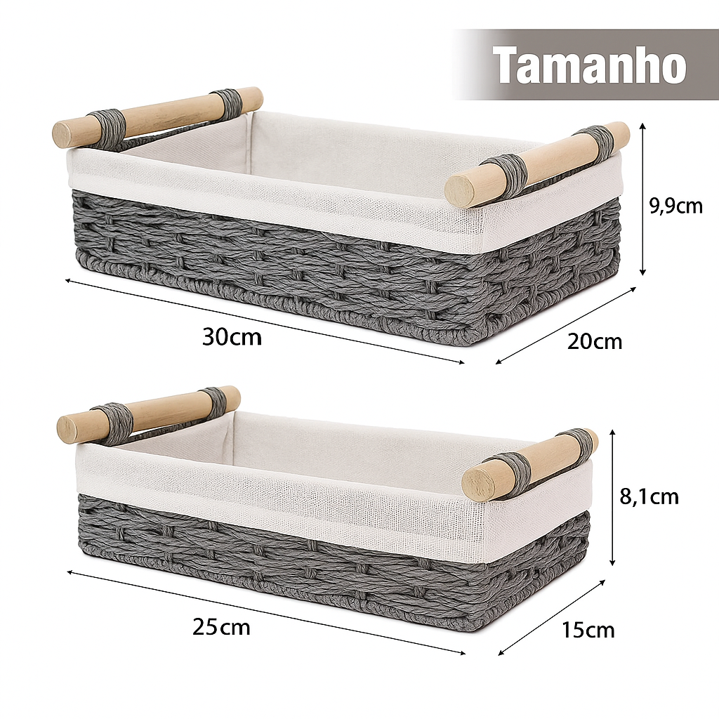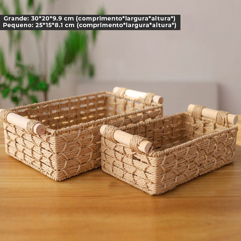 Feitas em fibra natural trançada com acabamento resistente, trazem um visual aconchegante e durável. As alças de madeira adicionam um toque sofisticado e facilitam o transporte.