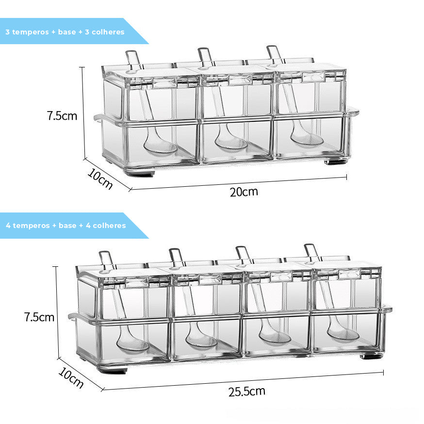 Cada pote possui tampa individual que evita mistura de aromas e mantém os temperos bem conservados. Acompanha colher exclusiva para cada compartimento.