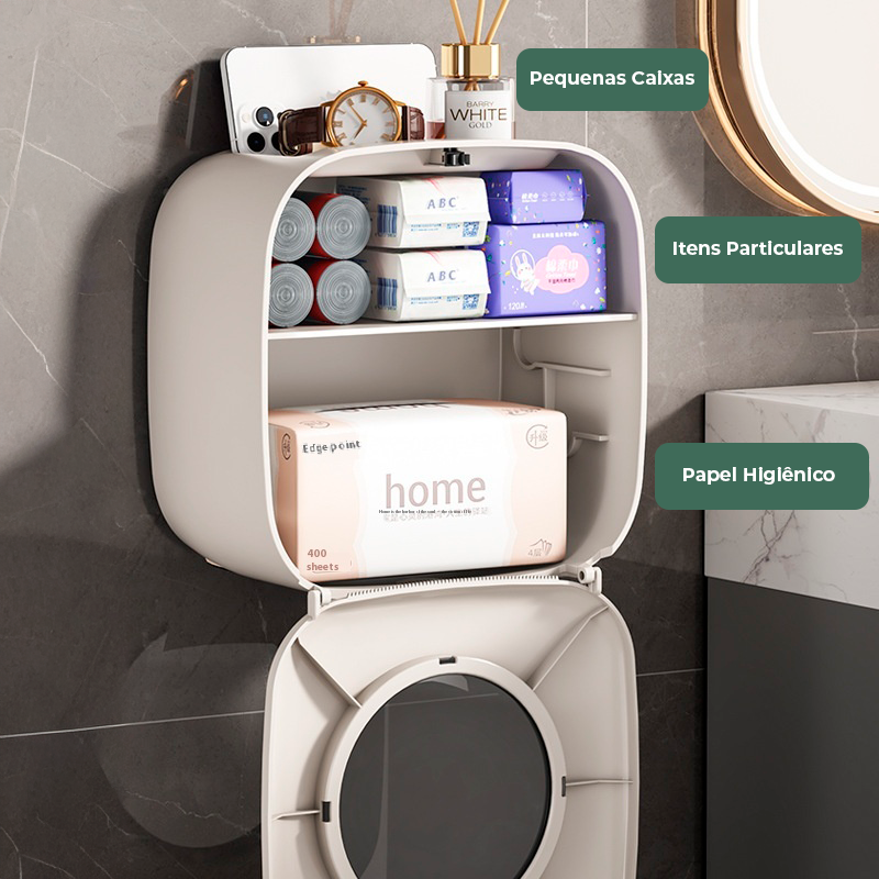 Transforme a rotina com o Dispenser de Papel Higiênico de Parede! Moderno e multifuncional, ele não só armazena papel higiênico, mas também conta com compartimentos extras para pequenos itens e uma prateleira superior para apoiar celular, relógio, perfumes ou acessórios.