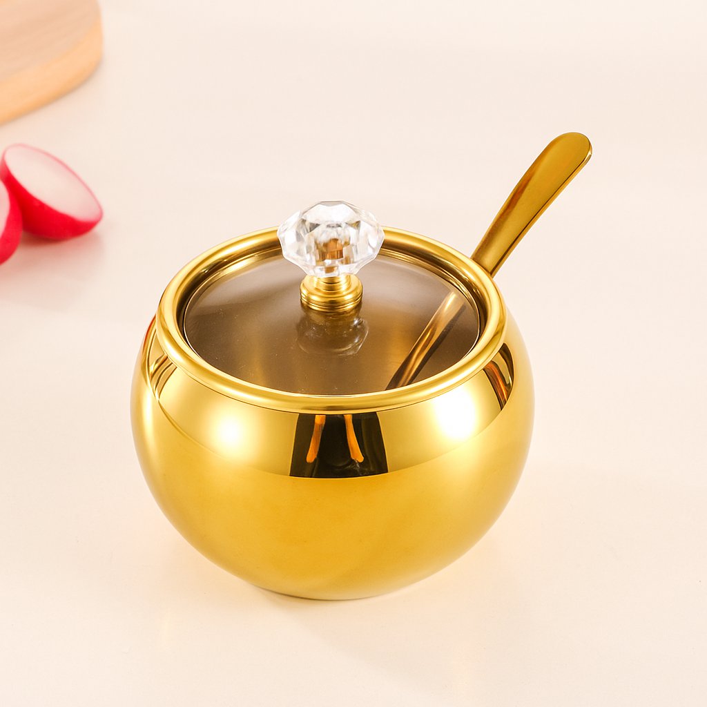 Cada pote possui tampa com detalhe em cristal e colher individual, garantindo praticidade e evitando mistura de sabores.