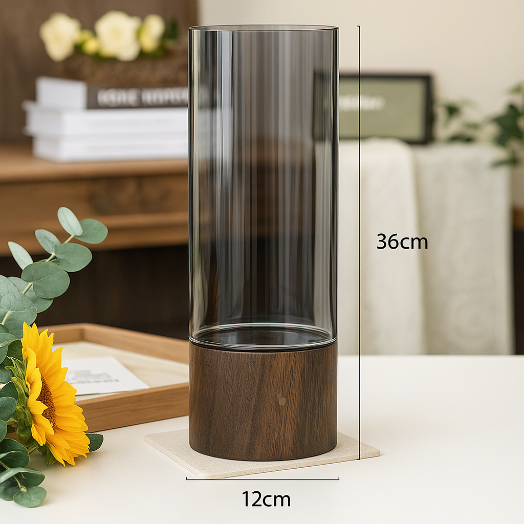 A base circular em madeira confere estabilidade ao vaso, além de destacar o contraste harmonioso com o vidro, tornando-o um elemento decorativo único.