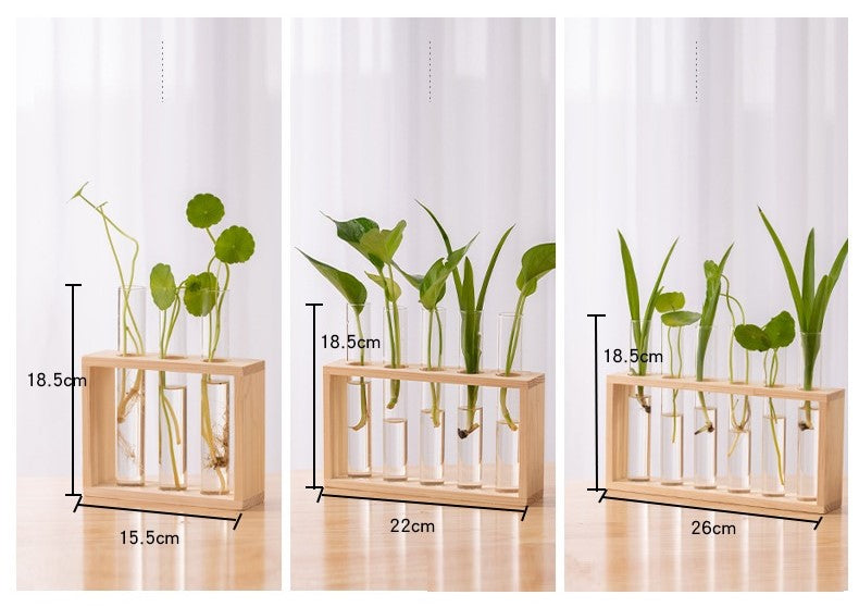 Estrutura em madeira natural com vasos de vidro, proporcionando um visual moderno e delicado. Perfeito para mesas, aparadores, escritórios ou salas.